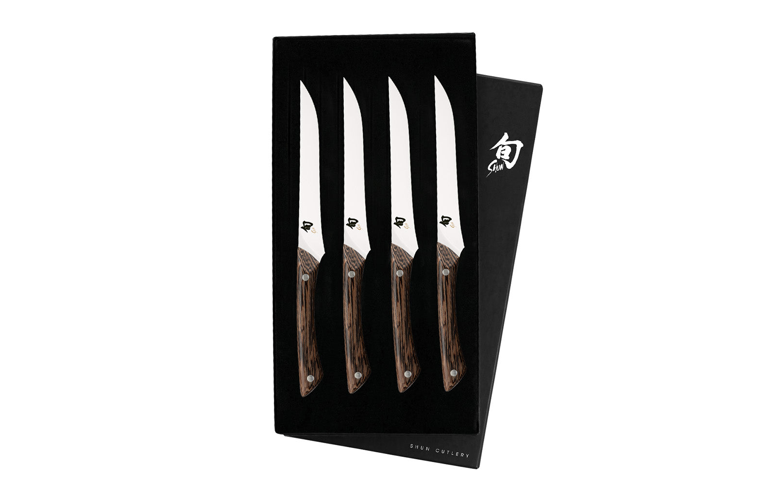 Tokyos renowned Shima Steakhouse serves some of the worlds finest beef. Shun named our beautiful Shima Natural Steak Knife Set in honor of this famous steakhouseand because we believe that the right steak knife can make even the worlds finest steak taste even better. Much of the delicious flavor in steak is contained in its juices, which are held inside by the fibers of the meat. Cutting with Shimas razor-sharp 16 edge means that far fewer meat fibers are cut with each slice, so that more of the juices and more of the flavor remain in the steak. These lightweight steak knives feature beautiful tagayasan (wenge) wood handles and offer easy, comfortable cutting control.