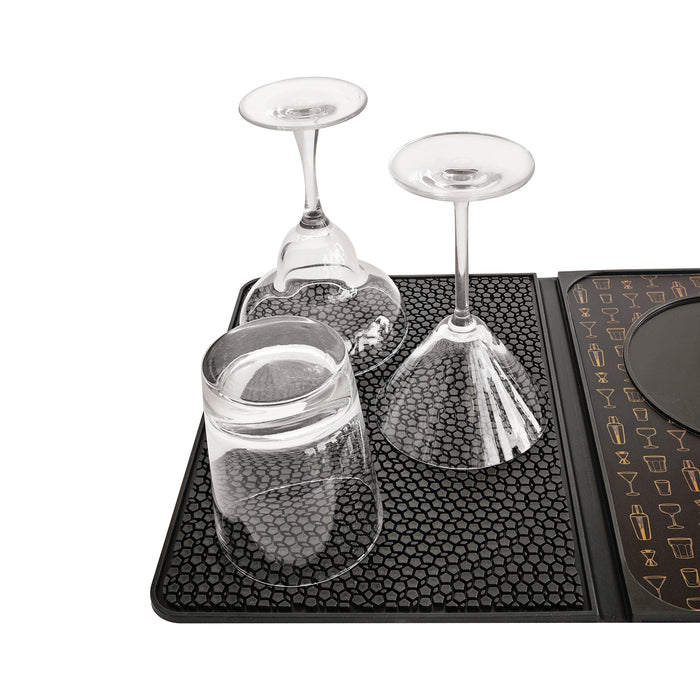 - COMPACT FOR EASY STORAGE: When the bar spill mat is not in use, easily fold it to be half the size for compact, easy storage. The bar accessory measures 18 x 13.25 inches when open and 8.75 x 13.25 inches when closed.