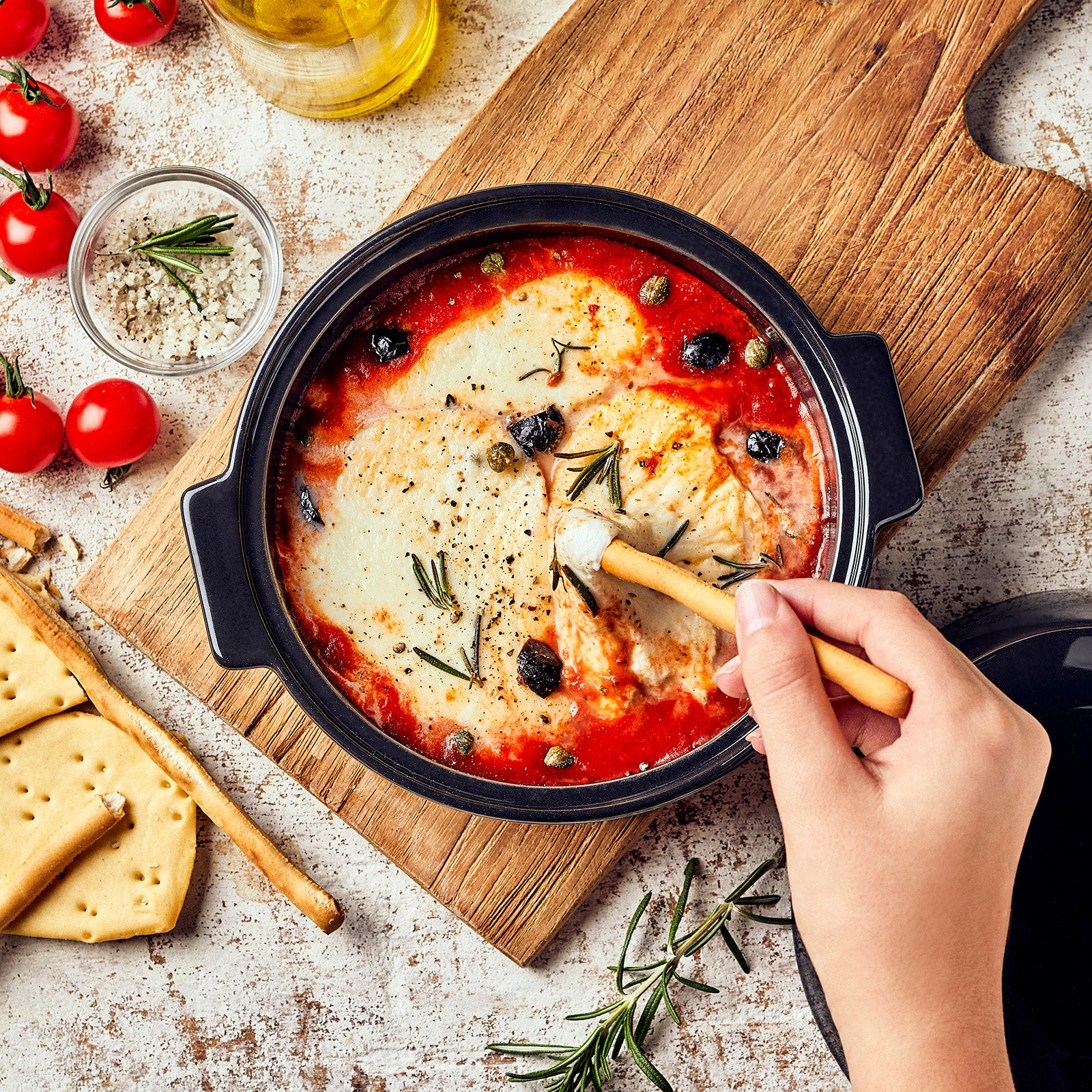 Whether it is brie, mozzarella or goat cheese; simply place the cheese in the baker, add sweet or savory garnish, close the lid and put in the oven. Once baked, serve directly in the baker.