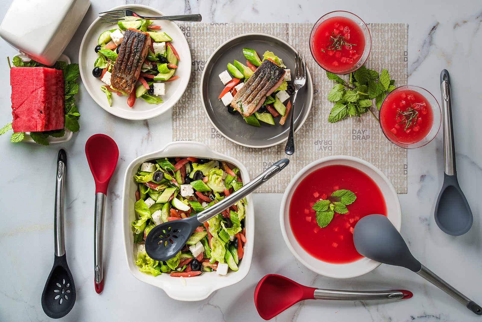 Designed to compliment Cuisipro's popular silicone tongs, the new silicone cooking tool collection features six essential kitchen tools, re-imagined using durable stainless steel handles and eye-catching red silicone heads. Tools are BPA-free and heat-resistant to 572 degrees F.