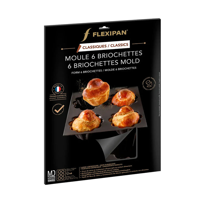 The Flexipan® 6 Mini-Brioche Mold is a versatile tool for creating single-serving delights like berry muffins, chocolate chip brioches, and mini lemon cakes. Each mold indent is generously sized at 3.15" in diameter, 1.38" in depth, and holds 3.6 fl oz, making it ideal for perfectly shaped mini-brioches and other sweet or savory treats. Made from a blend of silicone and glass knit, this mold is non-stick, requires no greasing, and offers an effortless release. Its durability is guaranteed for up to 3,000 uses, and it withstands temperatures from -40°C to 240°C, safe for the oven, refrigerator, and freezer. For best results, hand wash with a non-abrasive sponge.