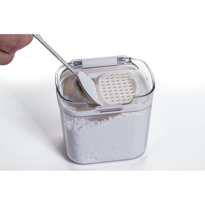 Perfect kitchen organizer for spices, herbs, candy and snacks. New silicone seal creates airtight storage for lasting freshness. The included leveler and sliding dusting screen is removable.