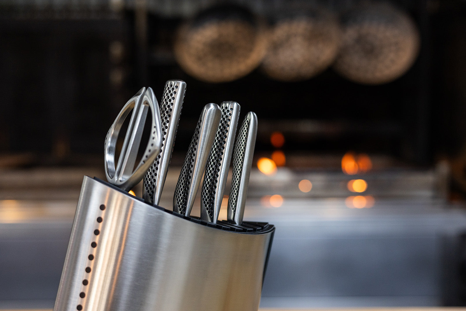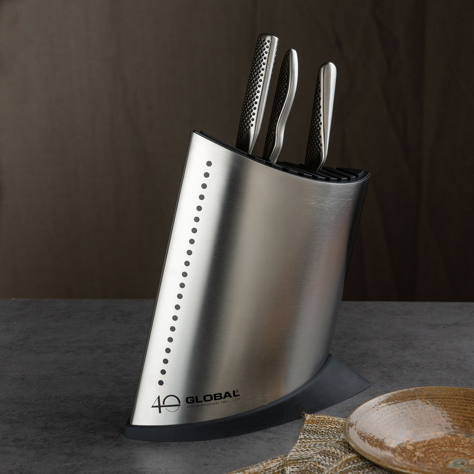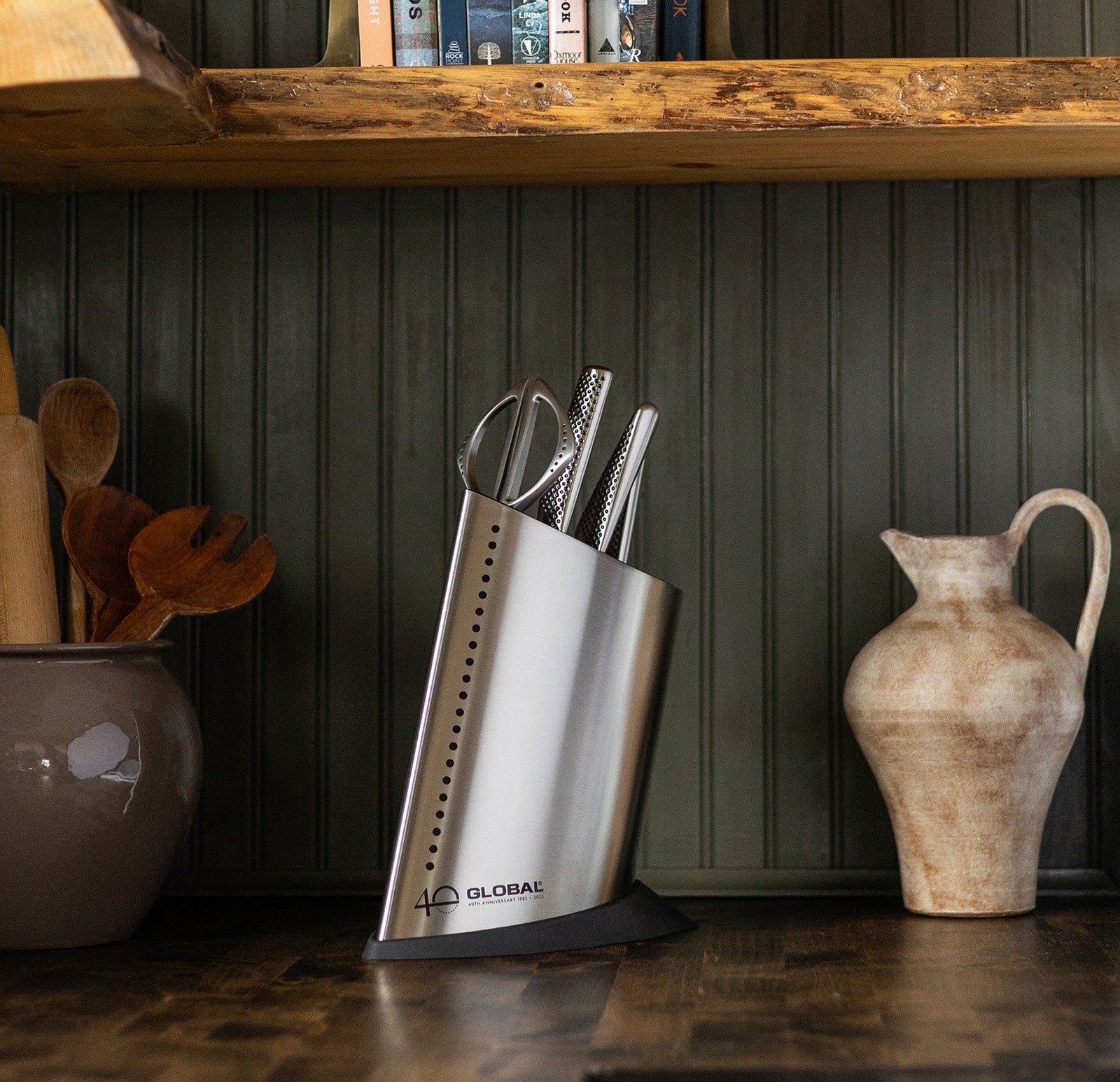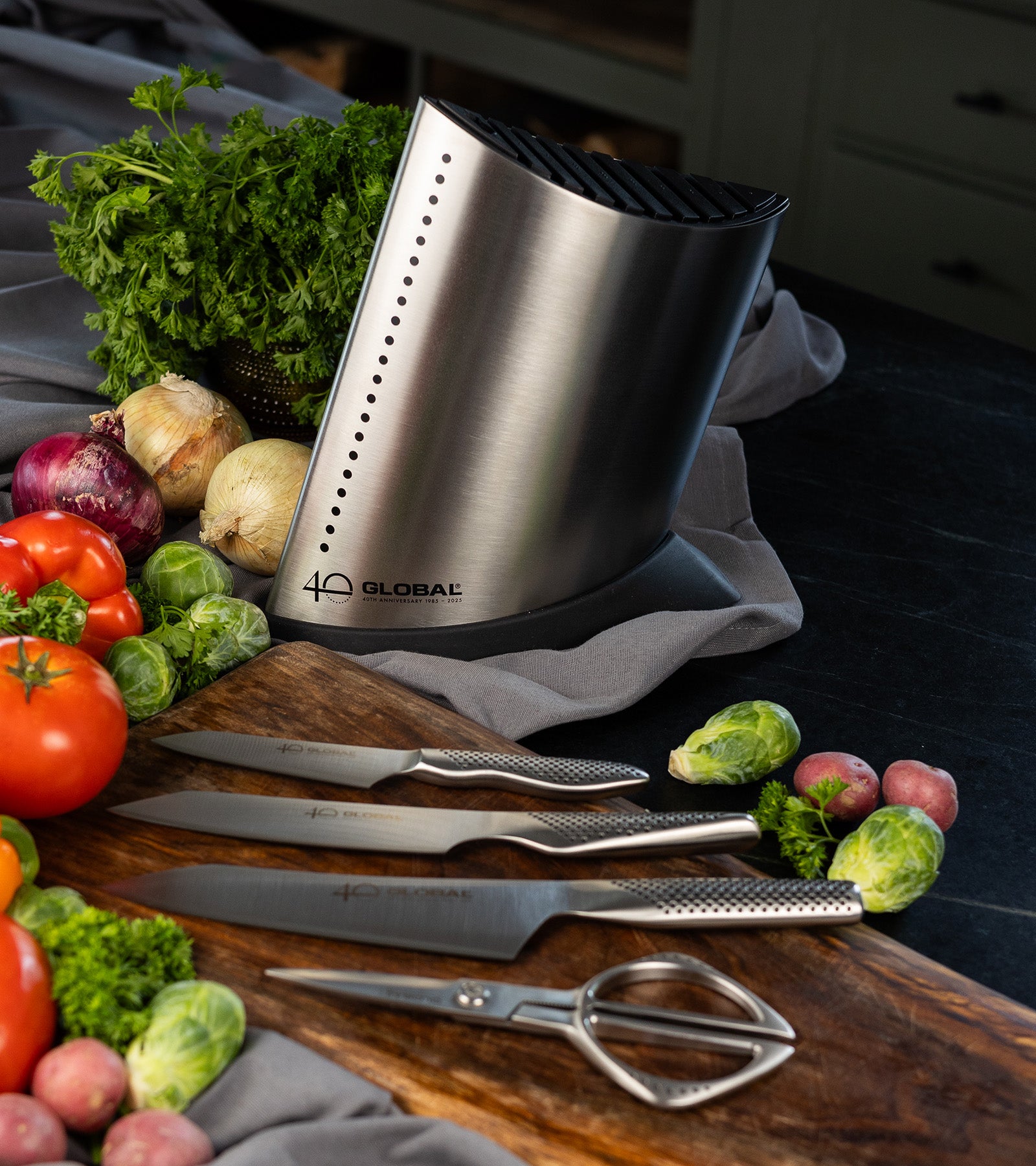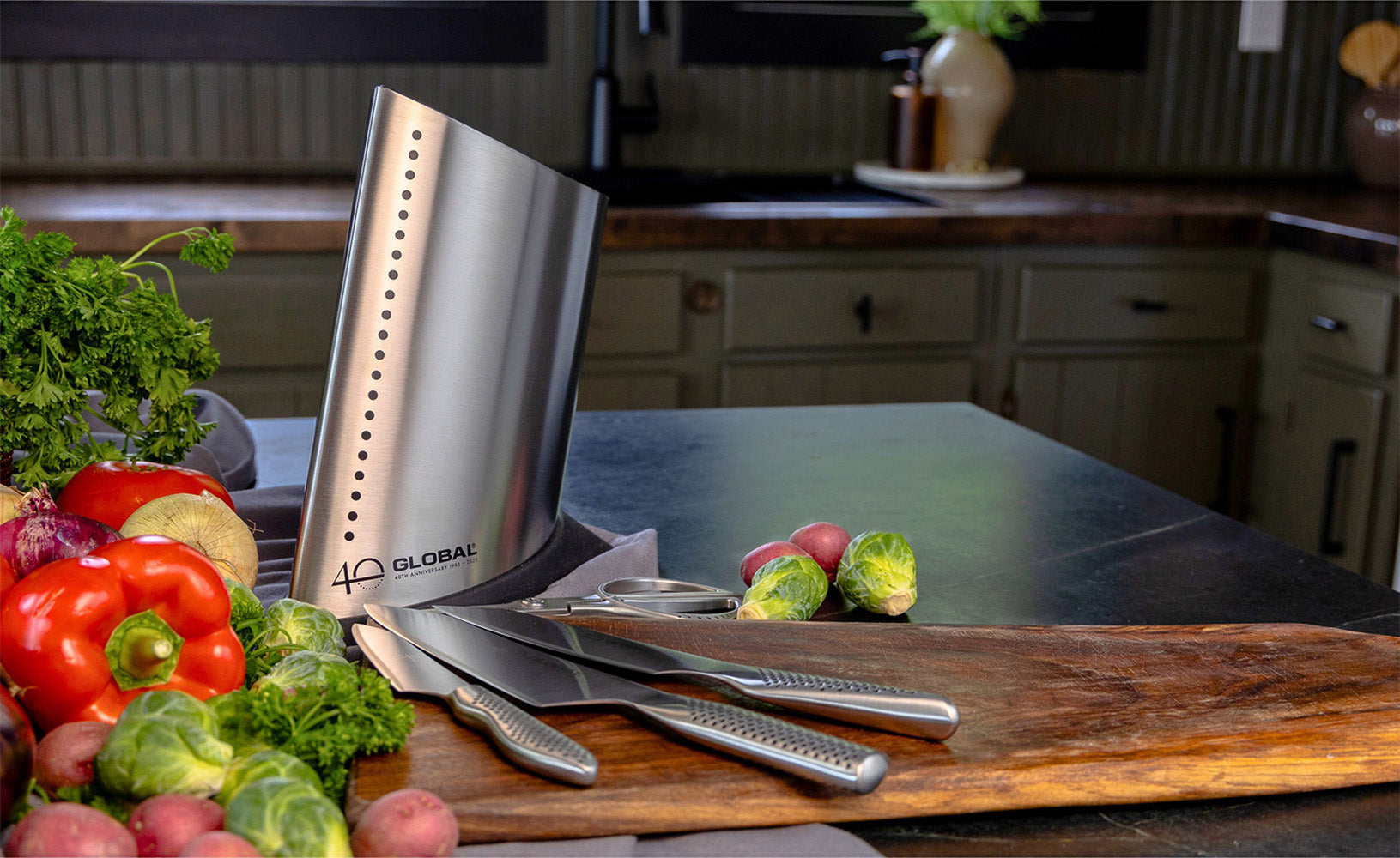 Commemorating four decades of iconic design and performance, the Global 40th Anniversary 5-Piece Knife Block Set is a limited edition collection that blends tradition with innovation. Each knife is crafted in Japan from CROMOVA 18 stainless steel for lasting sharpness, corrosion resistance, and impeccable balance. Housed in a stylish modern block, this compact set covers a wide range of prep tasks with beauty and precision.
