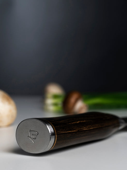 The Shun Premier 5-piece Starter Set is part of the beautiful Shun Premier line, which calls to mind the hand-forged knives of ancient Japan. While each knife still takes at least 100 handcrafted steps to complete, the materials Shun uses are among the most advanced in the industry. Each blade has a cutting core of Shun's proprietary VG-MAX super steel to take and hold a precision edge. The layered Damascus cladding supports the core and provides additional stain resistance. Near the edge of the blade, where the steels meet, an undulating line is formed, similar to the hamon formed when samurai swords are tempered using a traditional clay-baking technique. The hammered tsuchime finish acts like a series of hollow-ground cavities to reduce drag. The handles nestle comfortably in the hand, while the embossed end cap adds balance and beauty.