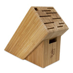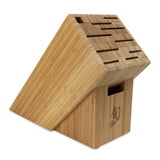 The Shun 11-Slot Bamboo Block displays your Shun collection beautifully and ensures the knife you need is always within easy reach. This attractive block is made of easy-to-clean, stain resistant bamboo, one of the worlds most renewable resources. All it requires to keep it clean is occasional wiping with a damp cloth. The natural hardness of bamboo means it resists knife marks and retains its handsome appearance even under consistent use. This block can accommodate up to nine knives, plus two additional slots for the honing steel and kitchen shears.