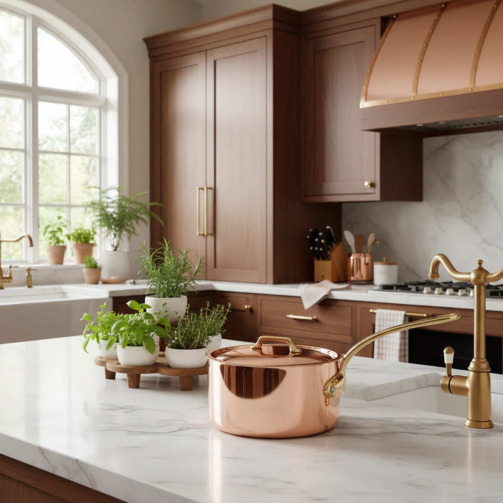 The polished copper exterior delivers superior thermal conductivity for precise cooking, while the stainless steel interior preserves the purity of flavors. Elegant cast brass handles offer balance and style, riveted for lifelong durability. Complete with a fitted lid, the M’Heritage 200 B saucepan transitions seamlessly from stovetop to table—an heirloom piece designed for both performance and beauty.