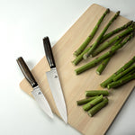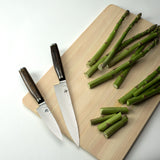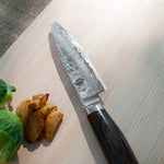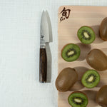 The Shun Premier Paring knife is a kitchen essential. In a way, you can think of it as the mini version of the Chef's knife because, like the Chef's knife, the Paring knife is quite versatile. Its compact size makes it ideal for peeling, coring, trimming, decorating, and other detail work. Generally, you'll use this knife in your hand rather than against a cutting board, though paring knives can also be used for chopping small foods, such as garlic cloves.