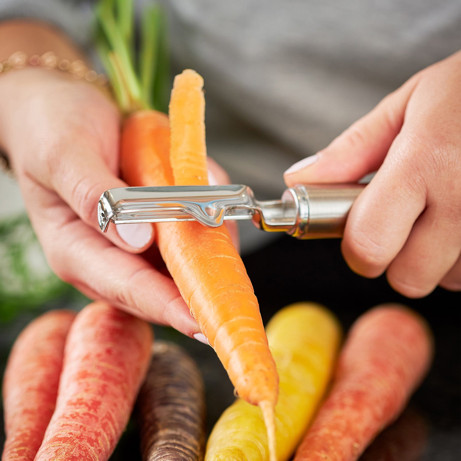 - Swivel Blade: Follows food contours for fast, even peeling