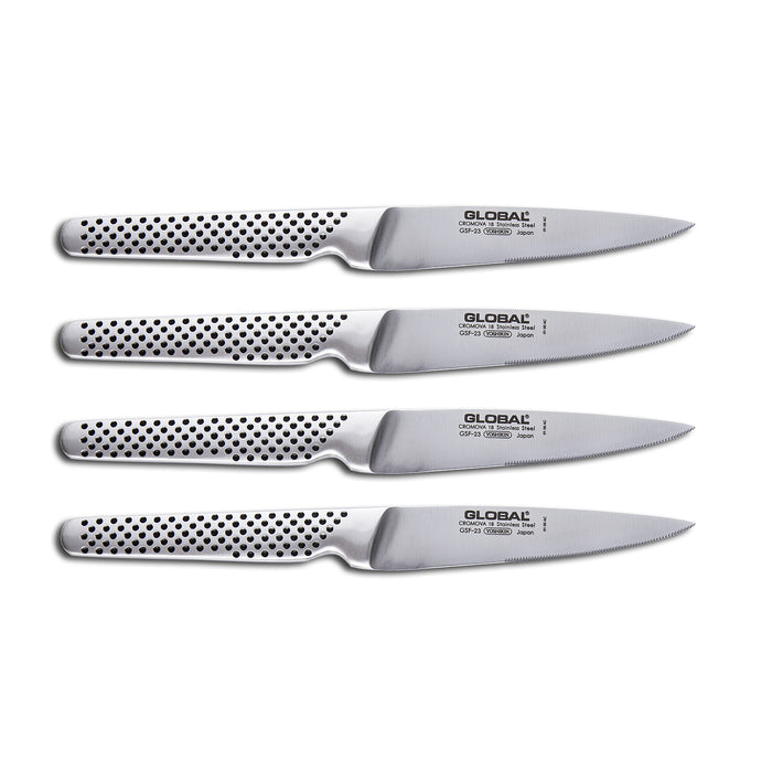 The Global GSF-4023 Steak Knife Set includes four precision-forged knives crafted in Japan for exceptional cutting performance and timeless style. Each knife features Global’s signature Cromova 18 stainless steel, ice-tempered and hardened to retain sharpness longer while resisting rust, stains, and corrosion. With a sleek, seamless design and perfectly balanced handles, these knives are ideal for slicing through steaks and other meats with ease and control. Whether you're hosting a dinner party or upgrading your everyday tableware, this set delivers unmatched quality and performance.