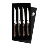 Tokyos renowned Shima Steakhouse serves some of the worlds finest beef. Shun named our beautiful Shima Natural Steak Knife Set in honor of this famous steakhouseand because we believe that the right steak knife can make even the worlds finest steak taste even better. Much of the delicious flavor in steak is contained in its juices, which are held inside by the fibers of the meat. Cutting with Shimas razor-sharp 16 edge means that far fewer meat fibers are cut with each slice, so that more of the juices and more of the flavor remain in the steak. These lightweight steak knives feature beautiful tagayasan (wenge) wood handles and offer easy, comfortable cutting control.