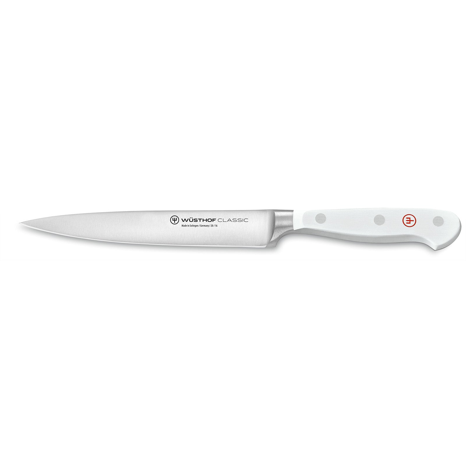 The Wusthof Classic 6 inch utility knife is a must have for cutting sandwiches, sausage, fruits, vegetables, and other kitchen utility tasks. Wusthof Classic knives are forged from a single piece of high carbon no-stain steel, a specially alloyed steel. Painstakingly manufactured, these knives are pure fun to work with and will turn even the preparation of a simple dish into a culinary pleasure. Made in Solingen, Germany.