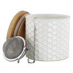 - Honeycomb Tea Caddy w/ Bamboo Lid & Stainless Steel Tea Ball Infuser (8 oz. 3.5" x 3") - Glossy White