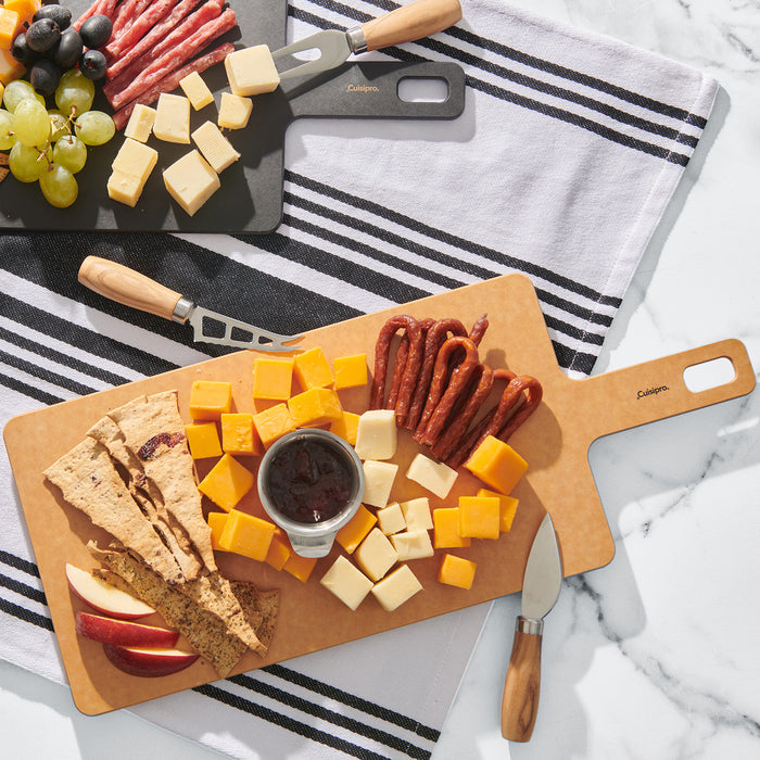 Introducing the Cuisipro Fibre Wood Paddle Cutting Board - a versatile and durable kitchen essential designed to elevate your culinary experience. Crafted from high-quality fibre wood, this cutting board offers the perfect balance of strength and sustainability. The natural wood grain pattern adds a touch of elegance to your kitchen while ensuring a sturdy and reliable surface for food preparation.