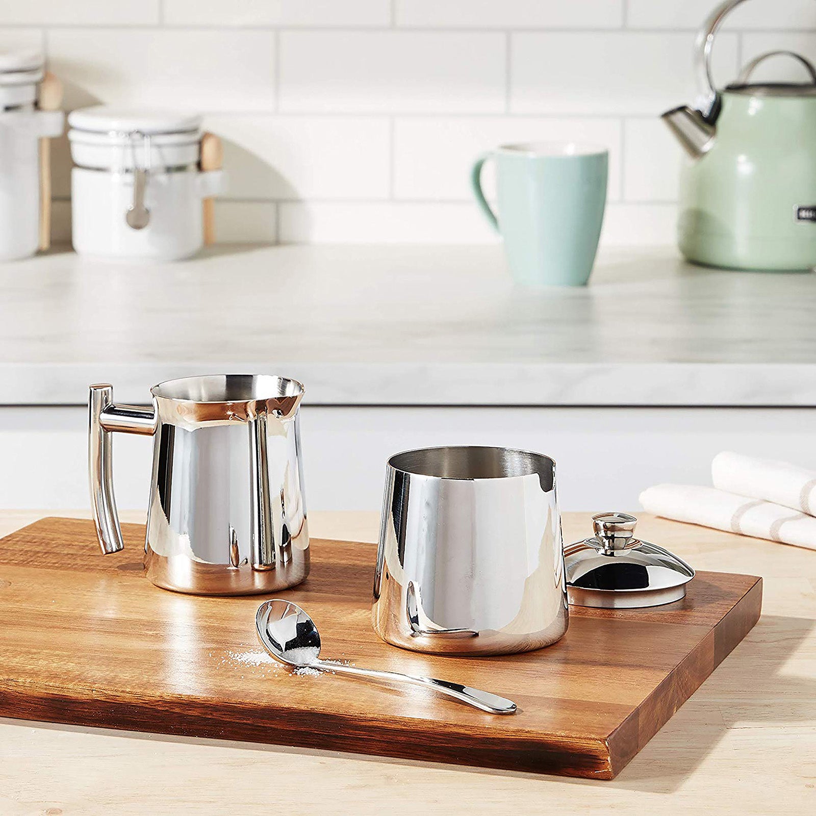 Everyone enjoys their coffee or tea differently, and with our mirror finish creamer, you can provide your guests with the milk, cream, or the alternative of their choice. Their stainless steel construction features a mirror finish that will look great in any kitchen and bring a modern aesthetic to any room you keep it. Our creamer features a no-drip spout so you will not have to worry about your guests making a mess while trying to customize their favorite drinks. Pair with our mirror finish sugar bowl and be ready for all your guests' beverage needs! Our creamer is dishwasher safe, so when the party is over, you can place our creamer in the dishwasher for a quick and easy clean.