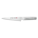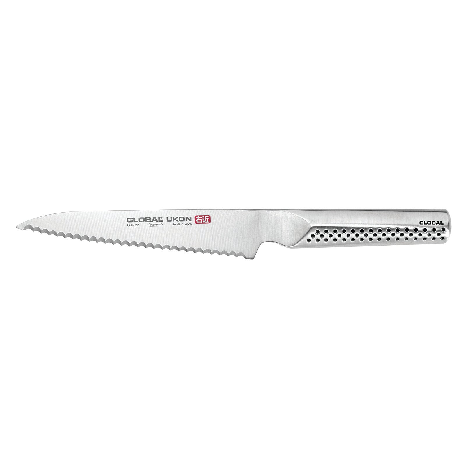 The Global UKON 6" Serrated Utility Knife is a fusion of Japanese artistry and practical design. This knife features a serrated edge perfect for cutting through tougher textures with ease, from crusty breads to delicate tomatoes. Crafted from premium CROMOVA 18 stainless steel, it ensures lasting sharpness and durability. The ergonomic handle with its signature dimple pattern offers a secure grip, making it an indispensable tool for everyday kitchen tasks.