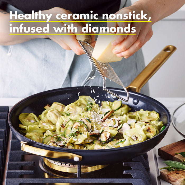 World-class tech meets minimalist style in GreenPan Reserve. But it's more than good looks: this pan's duoforged hard anodized aluminum construction makes it extra tough and scratch-resistant while also promoting even heat distribution. Each piece features our Thermolon Diamond Advanced healthy ceramic nonstick coating, featuring layers of diamonds to make it ultra-durable and heat responsive. With a design that's made to go the distance, the meal possibilities are endless; flavor-packed braises, stir fries, and perfectly seared seafood are just the beginning.