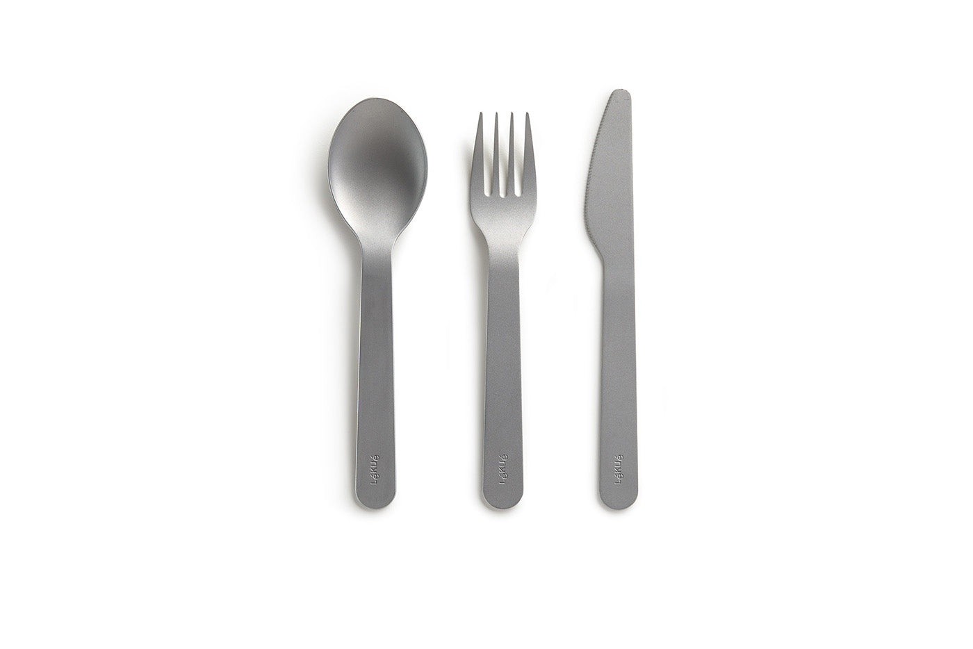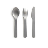 Set of 3 stainless steel compact cutlery - perfect for eating on the go. Spoon, fork, and knife included. Fits neatly together inside Lku's Lunchbox To Go. Storage sleeve included.