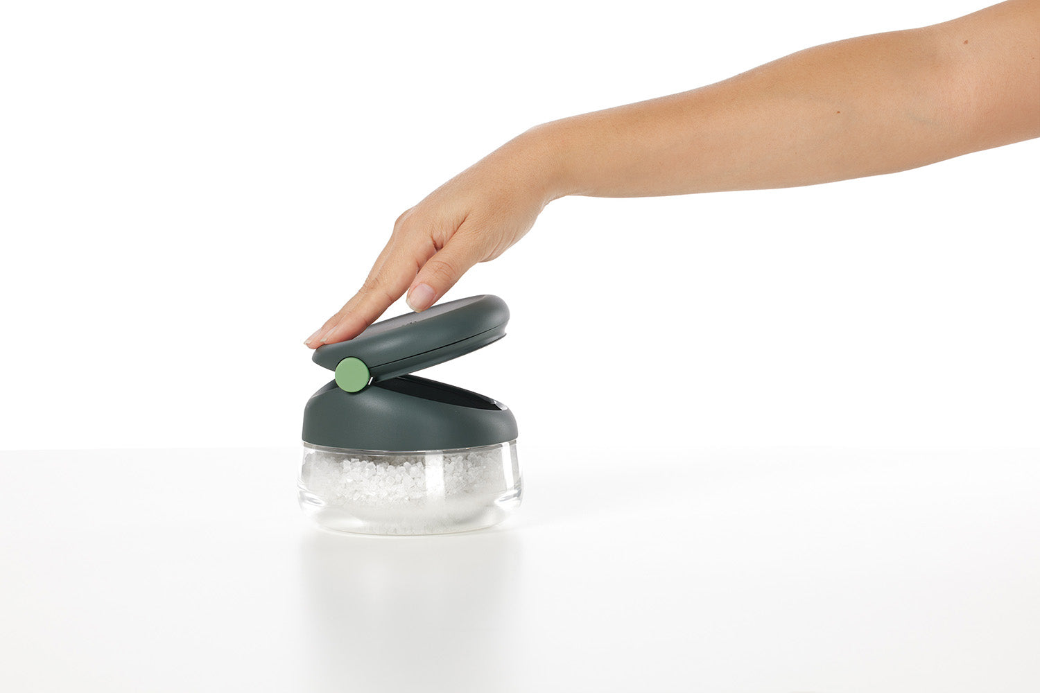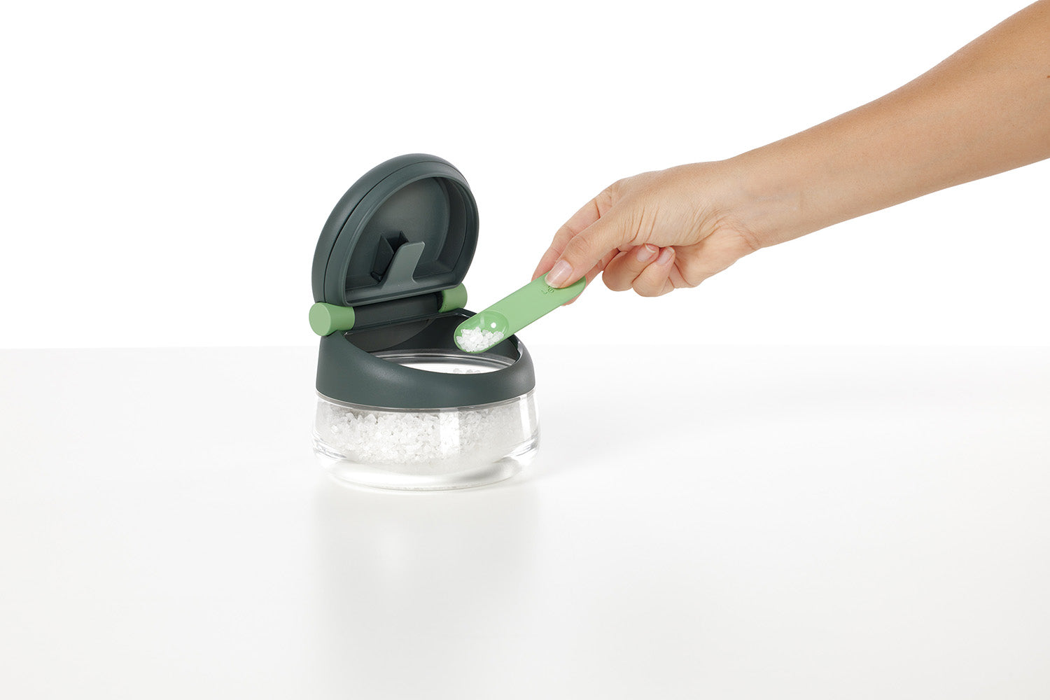 Looking for the right accessory for your seasonings? Say hello to the Lekue Salt Cellar! Stylish, modern, and convenient, this one-handed shaker is the perfect way to accessorize your kitchen counter. With its glass container and 500ml capacity, and slanted front, it's easy to take a pinch of salt (or whatever you need) without running short! Plus, it comes with a measuring spoon that stores in the lid for when you need just the right amount. Saving the day - and your salt! - has never been so easy.