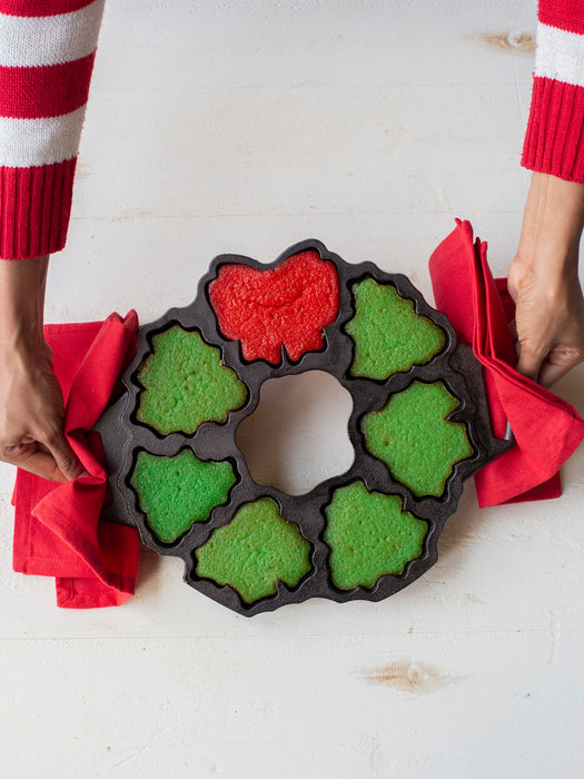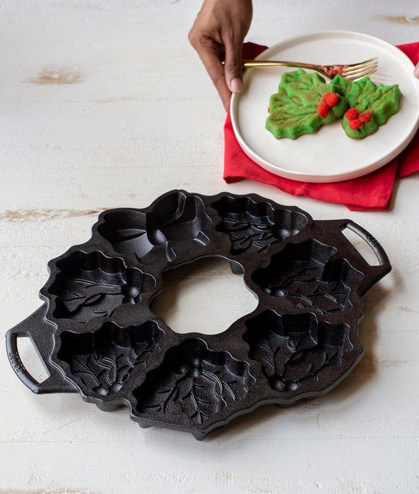 Want the perfect holiday centerpiece? With the Holiday Wreath Pan, you can bake mini cakes that will wow your guests. Crafted with iron and oil in America, its naturally seasoned baking surface doesn't dent, bend, or warp at high temps so you can serve memorable moments for generations. It provides excellent heat distribution and retention for consistent, even baking. Seasoned and ready to use.