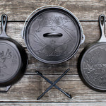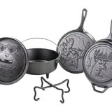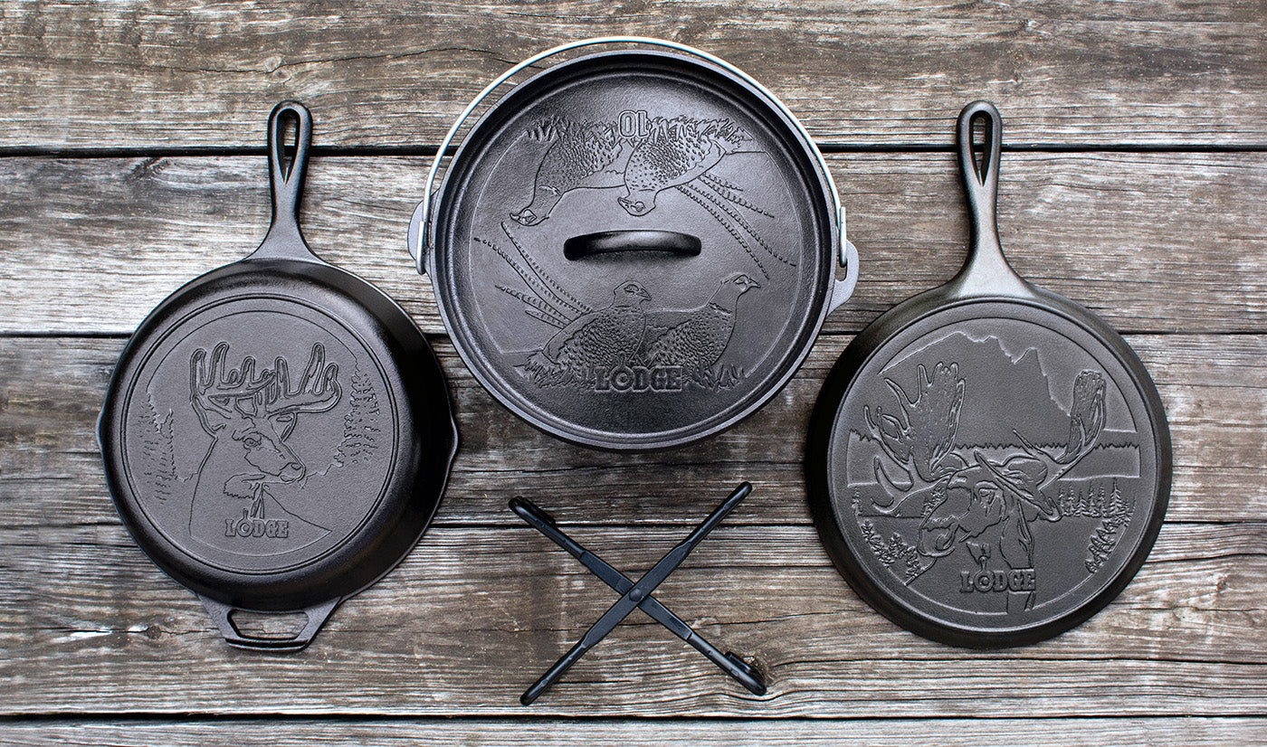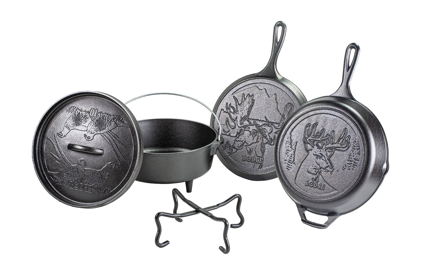 Get the complete outdoor cooking experience with this 5 piece set! The unique wildlife designs make this set the perfect gift that will be cherished for decades. This 5 Piece Set includes a 10.5 Inch Griddle With Moose Scene, 10.25 Inch Skillet With Deer Scene, 4 Quart (10 Inch) Camp Dutch Oven, 10 Inch Camp Lid With Pheasant Scene, and 4-in-1 Camp Dutch Oven Tool.