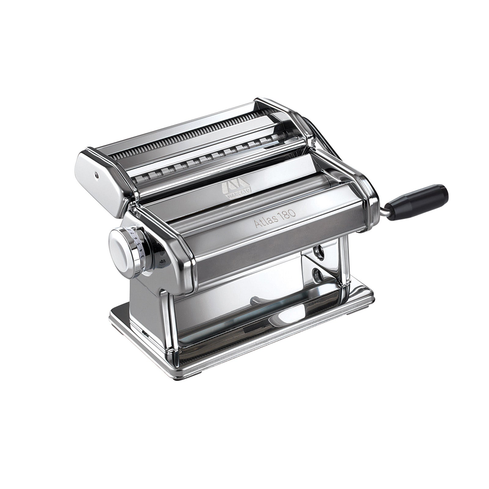 The Marcato Original World-Famous Atlas 180 Pasta Machine, called the Ferrari of the pasta machine world by Cook's Illustrated, rolls and cuts pasta dough for making traditional Italian pasta at home. Nothing tastes better than fresh authentic homemade pasta and learning how to make fresh pasta couldn't be easier! Easily make 3 pasta shapes, lasagna, fettuccine, and tagliolini. The adjustment dial easily controls the dough thickness and rolls homemade pasta dough evenly for a consistent texture, cook time and taste. Rolled pasta cooks more evenly and absorbs more delicious sauce. Roll dough up to 180-millimeters wide and quickly choose from 10 different thickness settings, between a paper-thin 0.6-millimeters to 4.8-millimeters, to personalize pasta on the fly to each recipe. The Atlas 180 Pasta Machine is equipped to attach a Pasta Drive motor, which is sold separately. No other attachments are available for this model. Made in Italy from chrome-plated steel. Wipes clean with a dry brush or cloth after each use. Includes the Pasta Machine, pasta cutter, hand crank, clamp, complete instructions and a 10-year manufacturer's warranty.