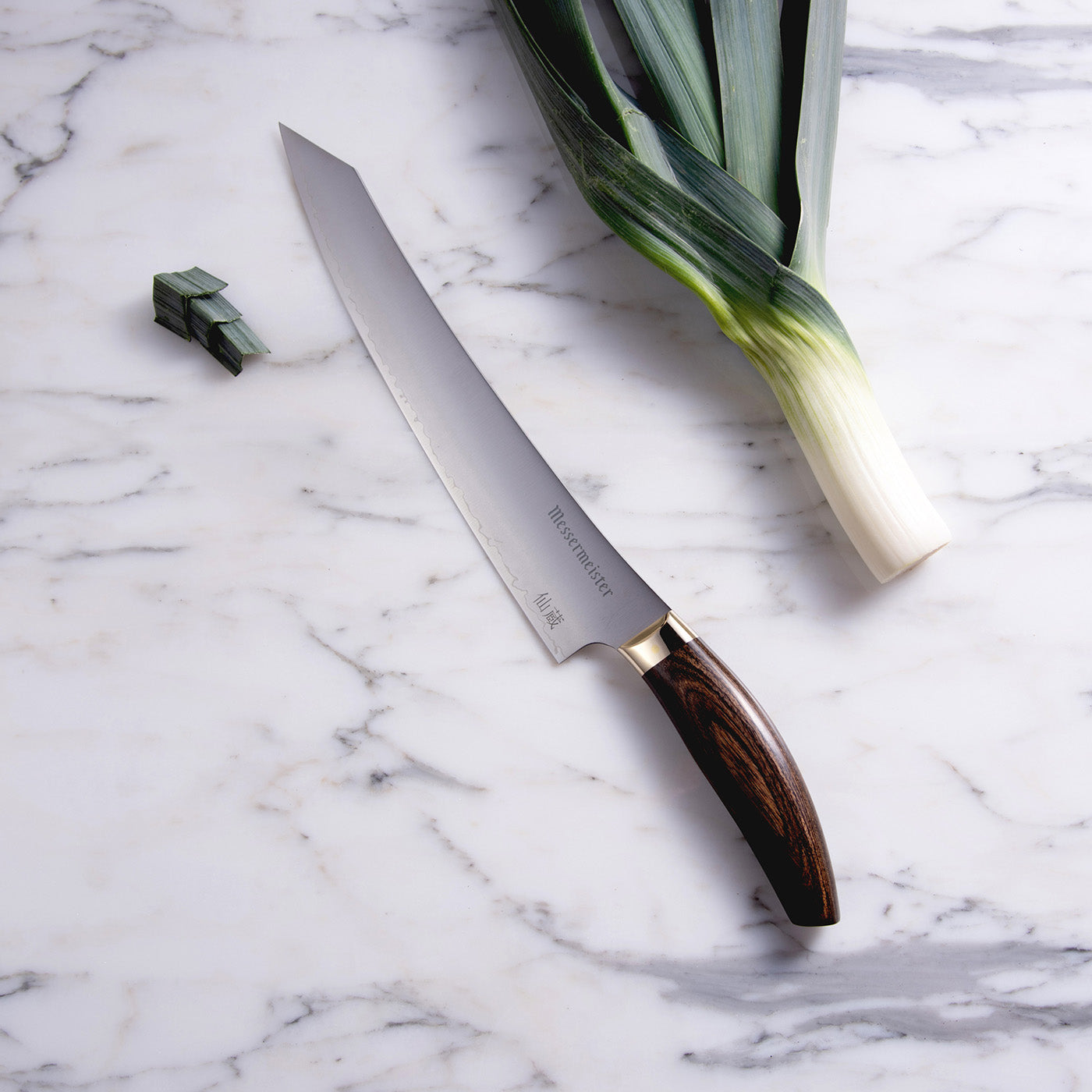 Crafted by 3rd generation knife artisans in the historical cutlery city of Seki, Japan, the Messermeister Kawashima 10 Slicing Knife, has a narrow spear-point, fine-edge blade that is used for medium to large carving chores. It separates meat from the bone and slices it into thin serving portions.