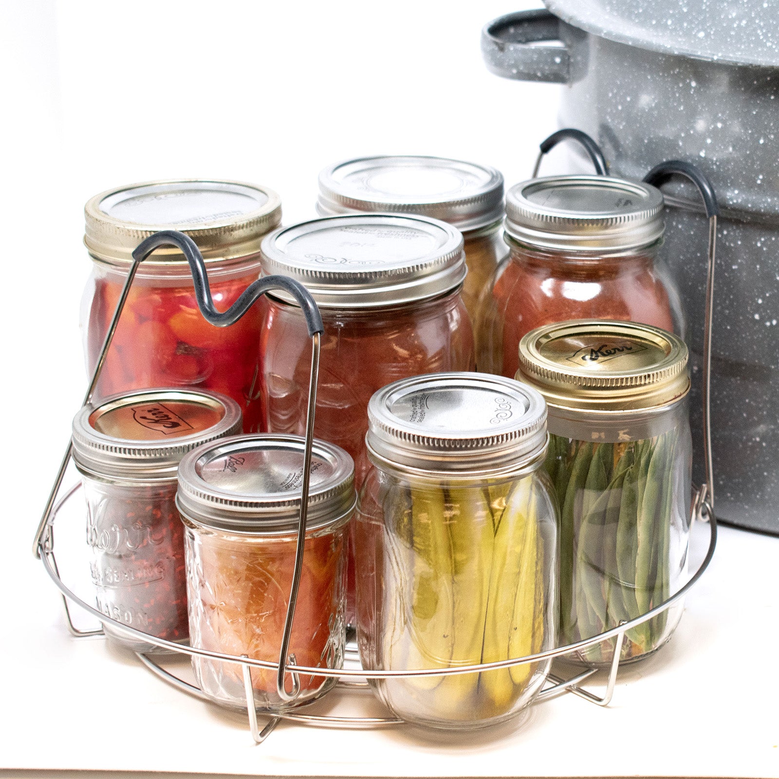 - Wide-loop handles: Make it easy to lift and lower jars into and out of boiling water.