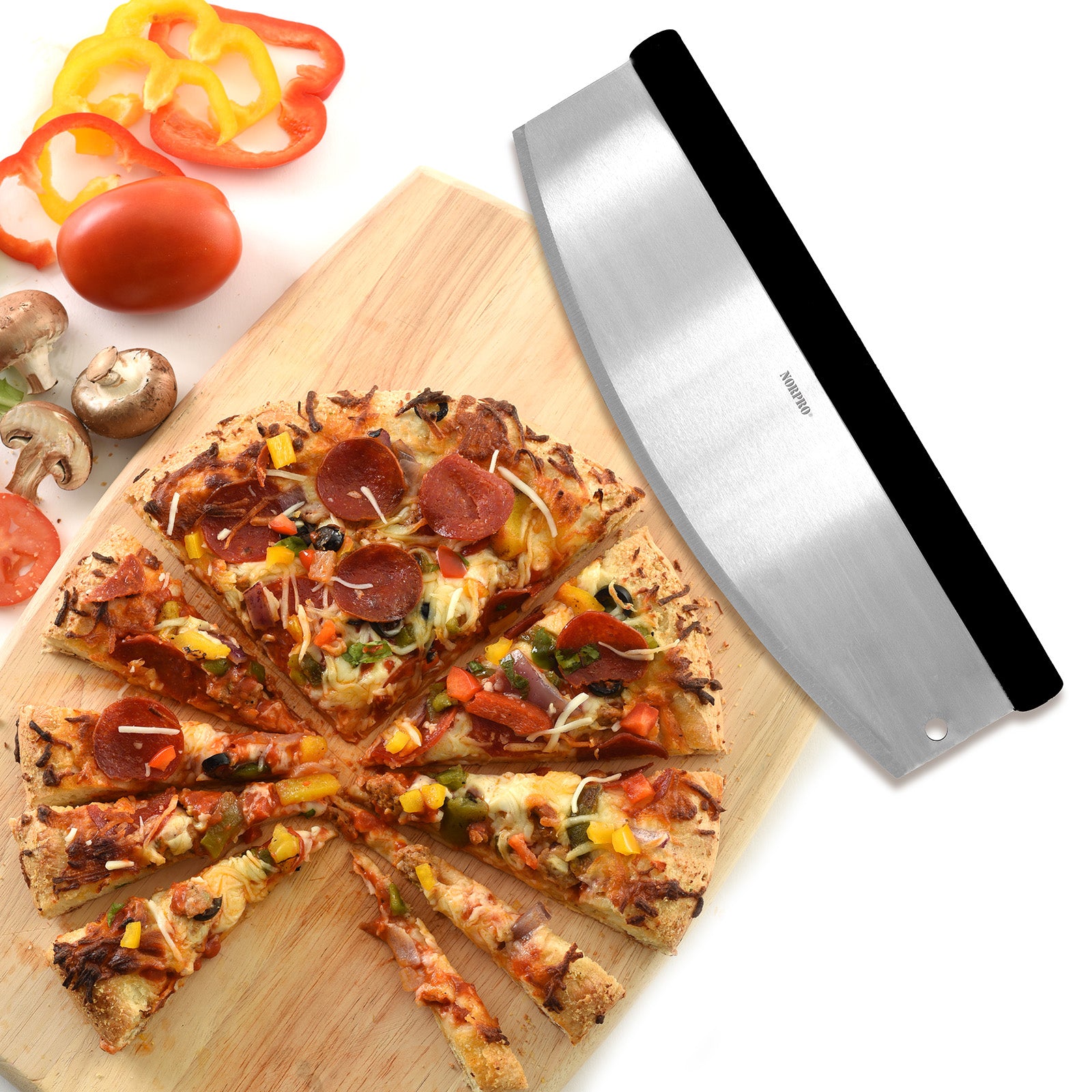 The Norpro Grip-EZ Multi-Use Rocking Pizza Cutter is designed for fast, controlled cutting with minimal effort. Featuring a wide stainless steel rocking blade and an ergonomic Grip-EZ handle, it allows you to slice cleanly through pizza, flatbreads, and baked goods using a simple rocking motion.