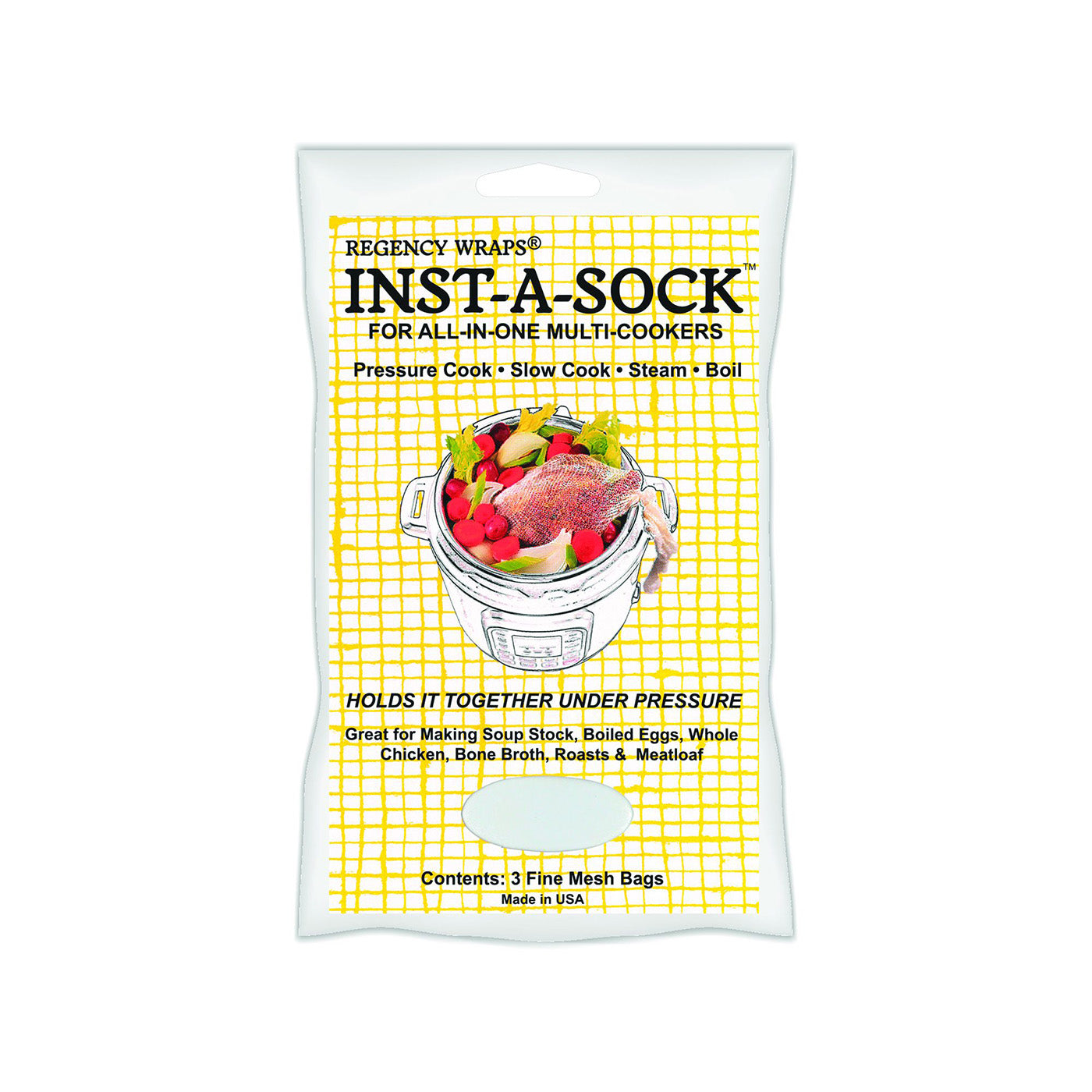 Regency Wraps mesh bag for pressure cookers, multi-cookers, steamers, and slow cookers easily fits whole chickens, meat loaf, fish, eggs, vegetables, and assorted roasts. Perfect for keeping your meal together under pressure.