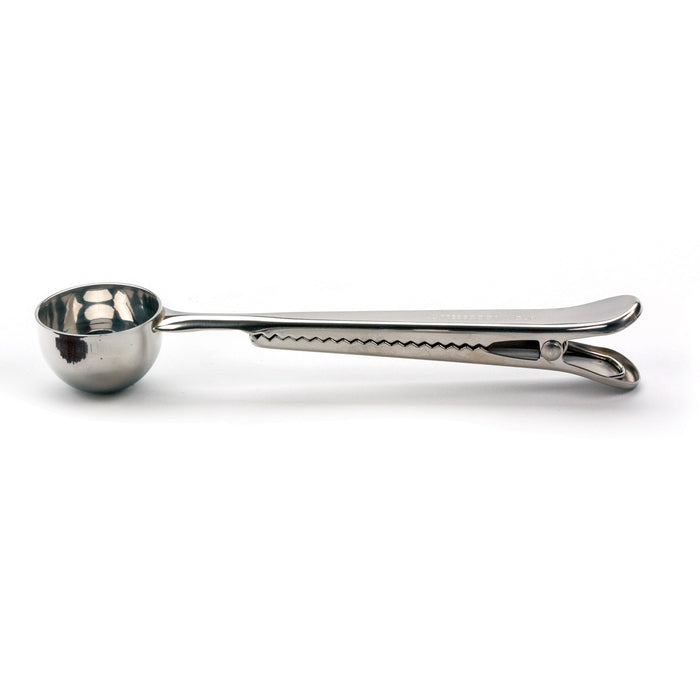Scoop, measure and clip with this 18/8 stainless steel coffee accessory. It has a 1-1/2 Tbl. measure, a clip to close and secure coffee bags and a 7" overall length. Dishwasher safe.