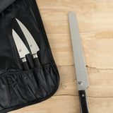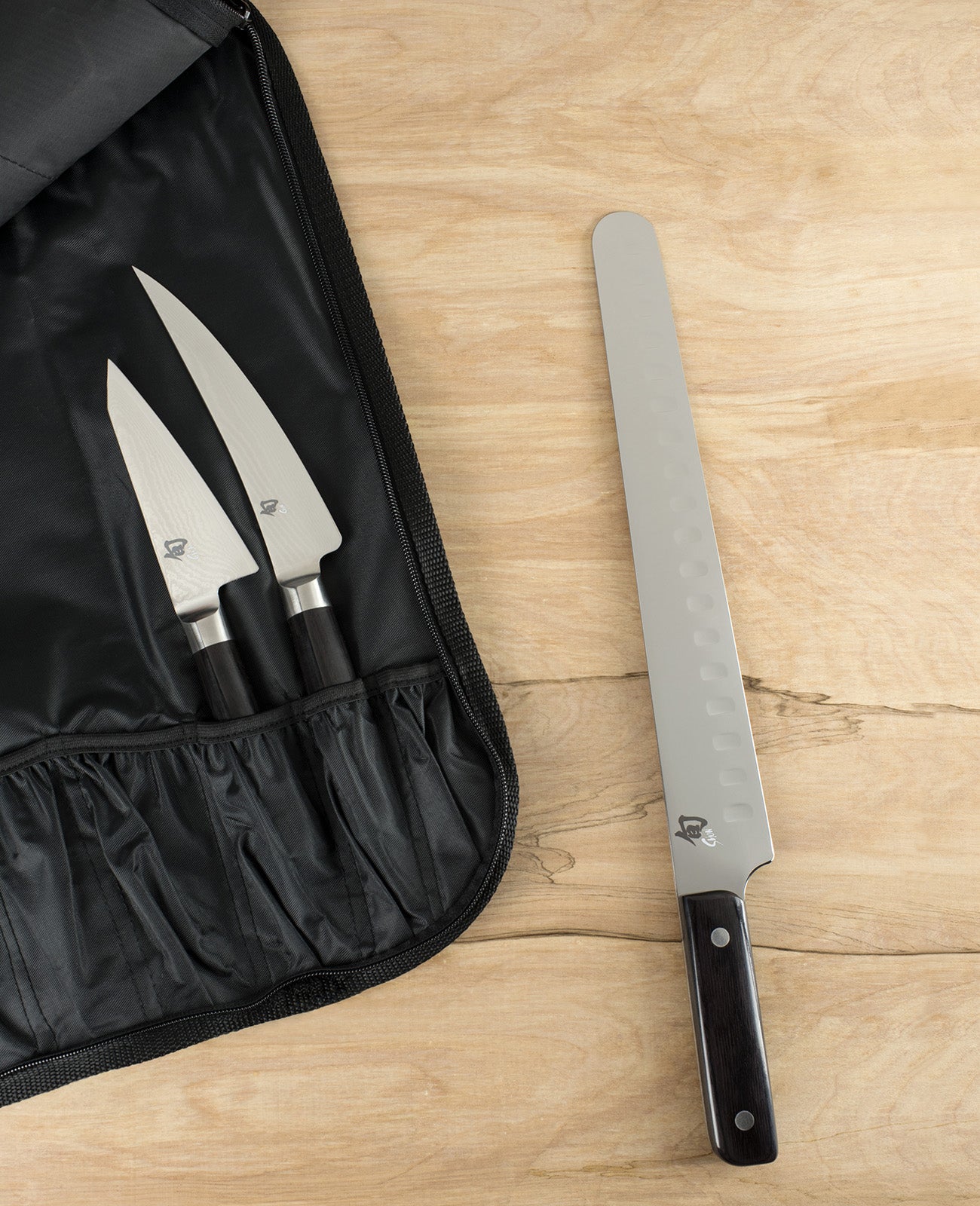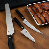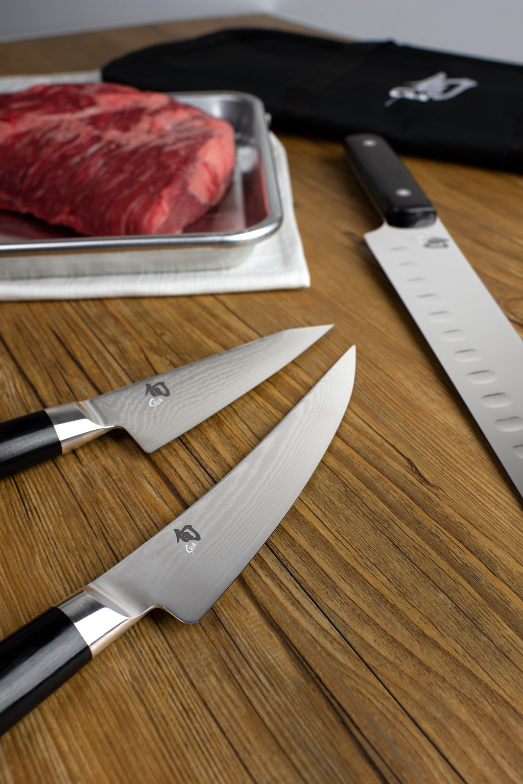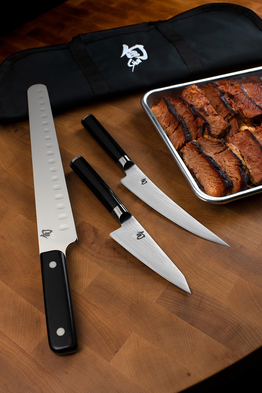 The Shun Classic BBQ Set features the three key knives you'll need to handle grill-worthy proteins of all types, all in a handsome Shun knife roll, perfect for when you take your BBQ show on the road. This gorgeous set includes the Shun Classic Asian Multi-Prep Knife, a Japanese-style poultry knife, the Shun Classic Boning/Fillet Knife, and the Shun Classic Brisket Knife, ideal for trimming and slicing larger cuts of meat, including brisket, ham, and turkey. Brisket knife includes its own wooden Saya, or sheath.