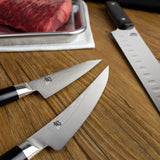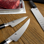 Both the Asian multi-prep knife and the boning/fillet knife feature the Shun Classic's beautiful Damascus-clad blades with Shun's proprietary high-performance VG-MAX stainless steel cutting core and D-shaped ebony PakkaWood handles. The brisket knife is made of Japanese AUS10A blade is highly refined, high-carbon, vanadium stainless steel with hollow-ground indentations to help food release more easily from the blade. All are sharpened to a Shun-sharp 16 edge and hold their edge for a long time. Shun Classics are sharp, durable, and corrosion resistant, as well as beautiful to behold. The Shun Classic line also offers you the widest assortment of both traditional culinary blade shapes and cutting-edge designs, so you can always find the right knife for the task.