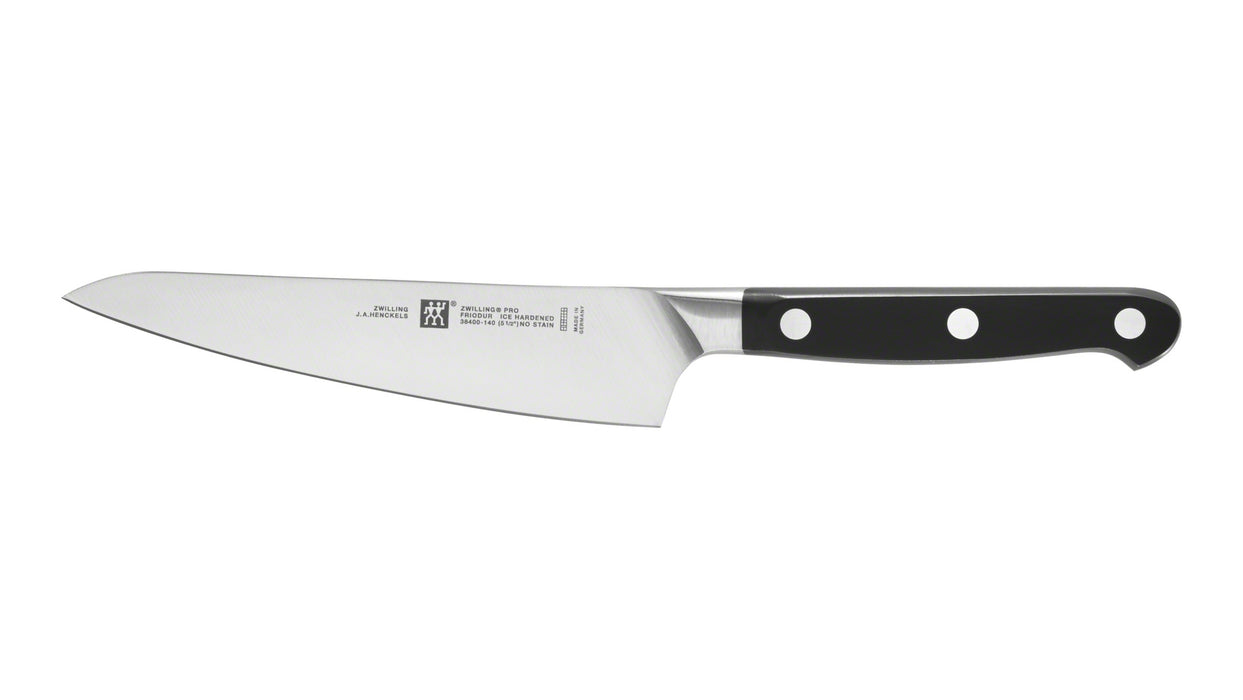 ZWILLING Pro is the most user-friendly knife available to market. The unique blade shape and ergonomic bolster are the result of 280 years of experience in knife making, and the rigorous study of how knives are used. A unique curved bolster supports the professional pinch grip, with thumb and index finger on the blade, for safe cutting and less fatigue. The blade was redesigned with a broader curve in the front to facilitate the rocking motion of Western cutting, while the straight back is ideal for the Asian chopping motion. The full length of the blade can be used when cutting and can be sharpened from bolster to tip Designed in Italy by Matteo Thun and made in Germany by ZWILLING J.A. Henckels, the company that sets the standard for exceptional cutlery worldwide. The ZWILLING Pro 5.5" Ultimate Prep Knife will become the go-to knife in your kitchen. It excels at a multitude of tasks like peeling and chopping vegetables and fruit, slicing meats and cheeses, butterflying chicken breasts, deveining shrimp and much more. The well-designed blade of the allows for plenty of knuckle clearance when you're chopping on a cutting board yet is small enough for in-hand paring tasks, such as peeling and trimming apples and potatoes. Cooks with small hands will appreciate the compact size of this versatile knife.